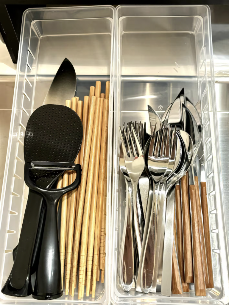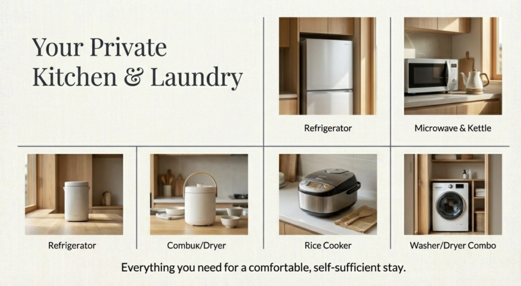Kitchen: Refrigerator, rice cooker, microwave, electric kettle, and a washer/dryer.