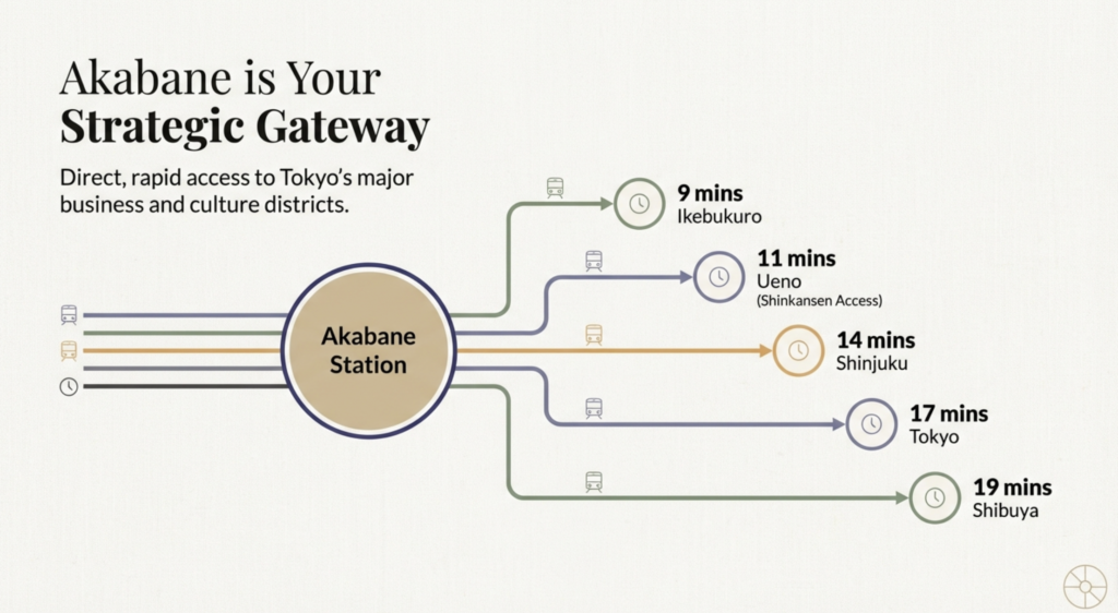 Akabane is a major transportation hub, offering direct and easy access to Tokyo’s most popular districts and sightseeing spots.