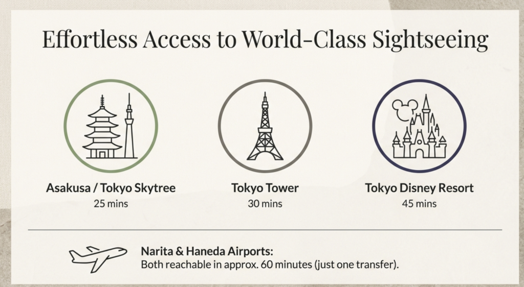 Both Narita and Haneda Airports are reachable in approximately 60 minutes with just one transfer.