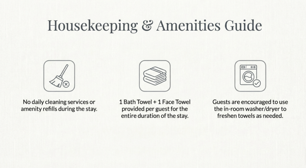 Cleaning & Replenishment: We do not provide daily cleaning services or amenity refills during your stay.