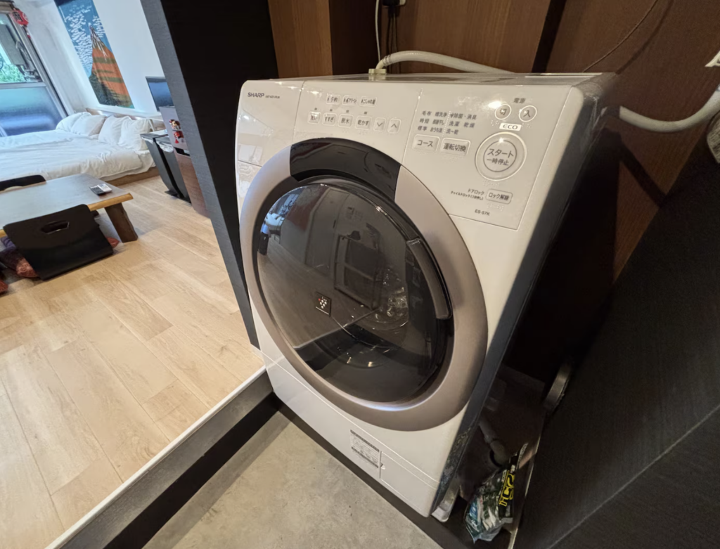 Kitchen: Refrigerator, rice cooker, microwave, electric kettle, and a washer/dryer.