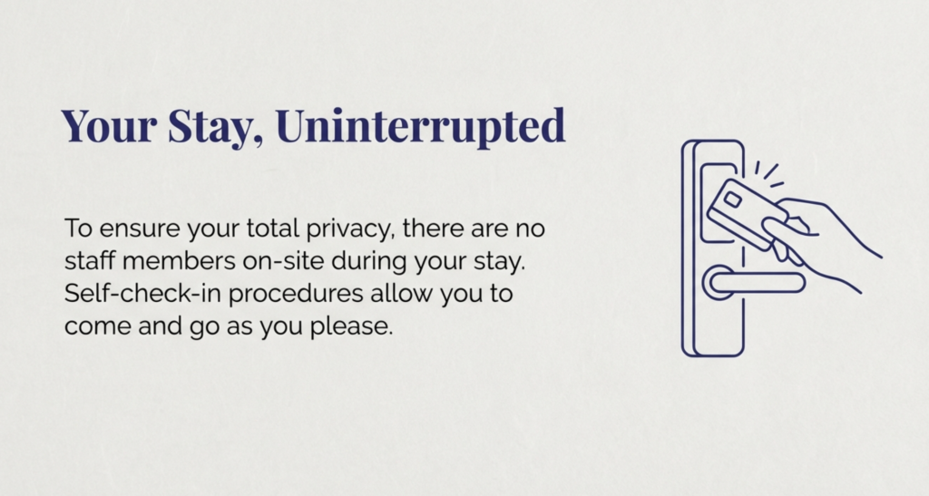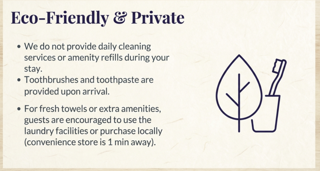 Cleaning & Replenishment: We do not provide daily cleaning services or amenity refills during your stay.