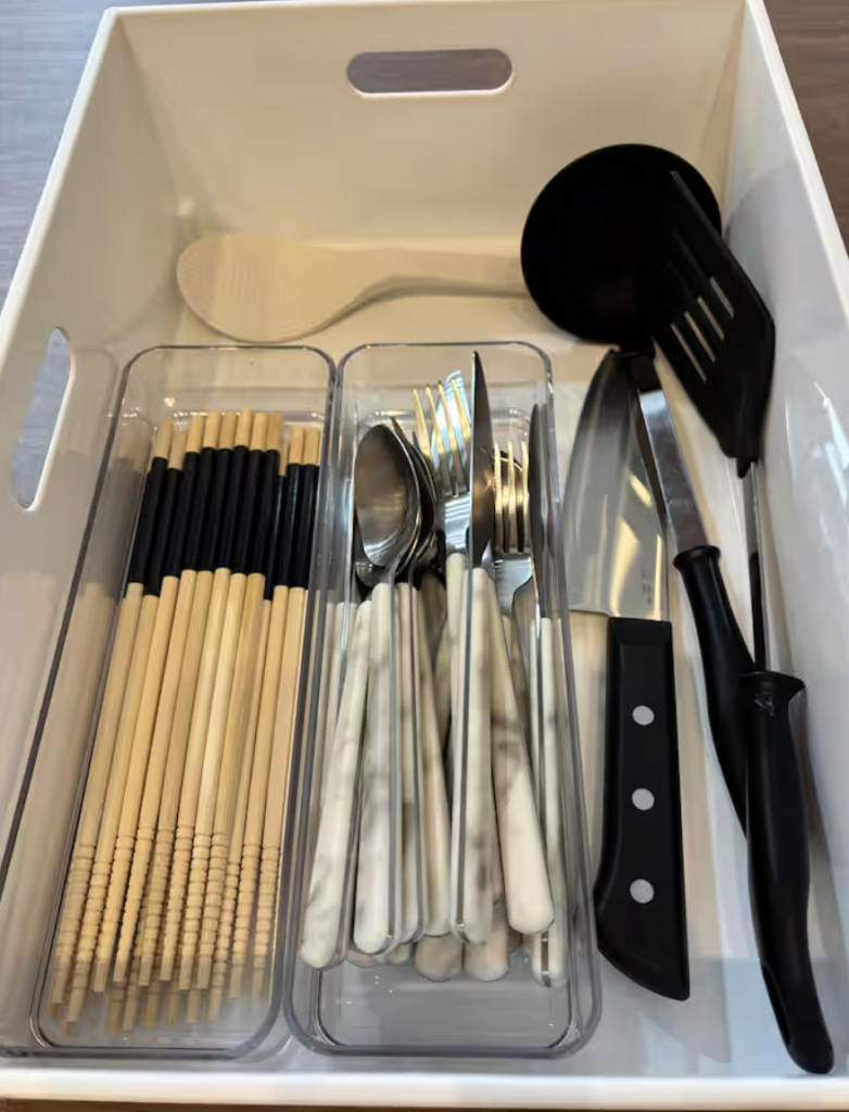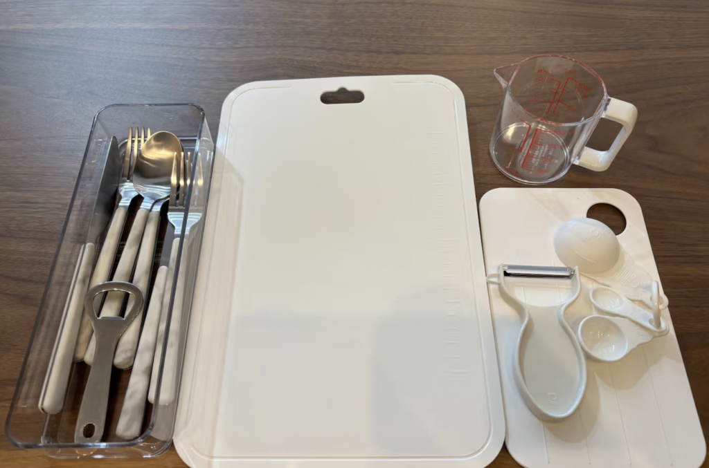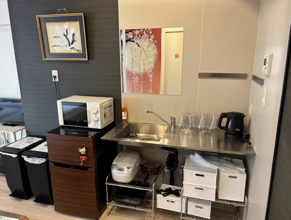 Kitchen: Refrigerator, rice cooker, microwave, electric kettle, and a washer/dryer.
