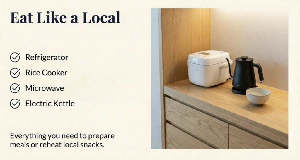 Bedroom: TV (with YouTube/Netflix), high-speed Wi-Fi, and a “Gashapon” capsule toy machine.
